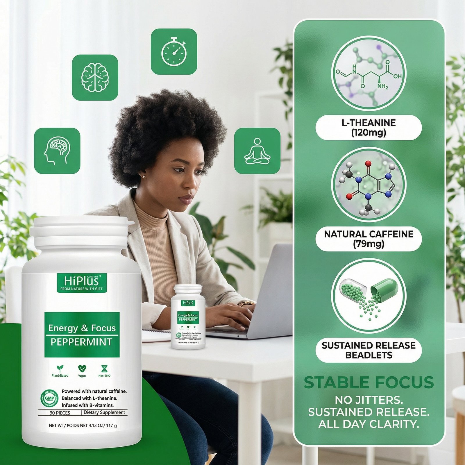 HiPlus® Energy Focus Capsules utilize innovative Low-Temperature Compression technology to maximize the preservation of the natural ingredients’ activity. Each serving contains a golden ratio of 79mg natural caffeine and 120mg L-theanine, designed to provide you with stable and sustained energy, eliminating the palpitations and sudden fatigue associated with traditional energy drinks. The formula is completely free of sugar, aspartame, and GMOs, and is supplemented with Vitamins B6 and B12 to enhance metabolism and mood support. Its refreshing mint flavor and pure plant-based formula make it an ideal choice for office workers, students, and gamers seeking peak performance.