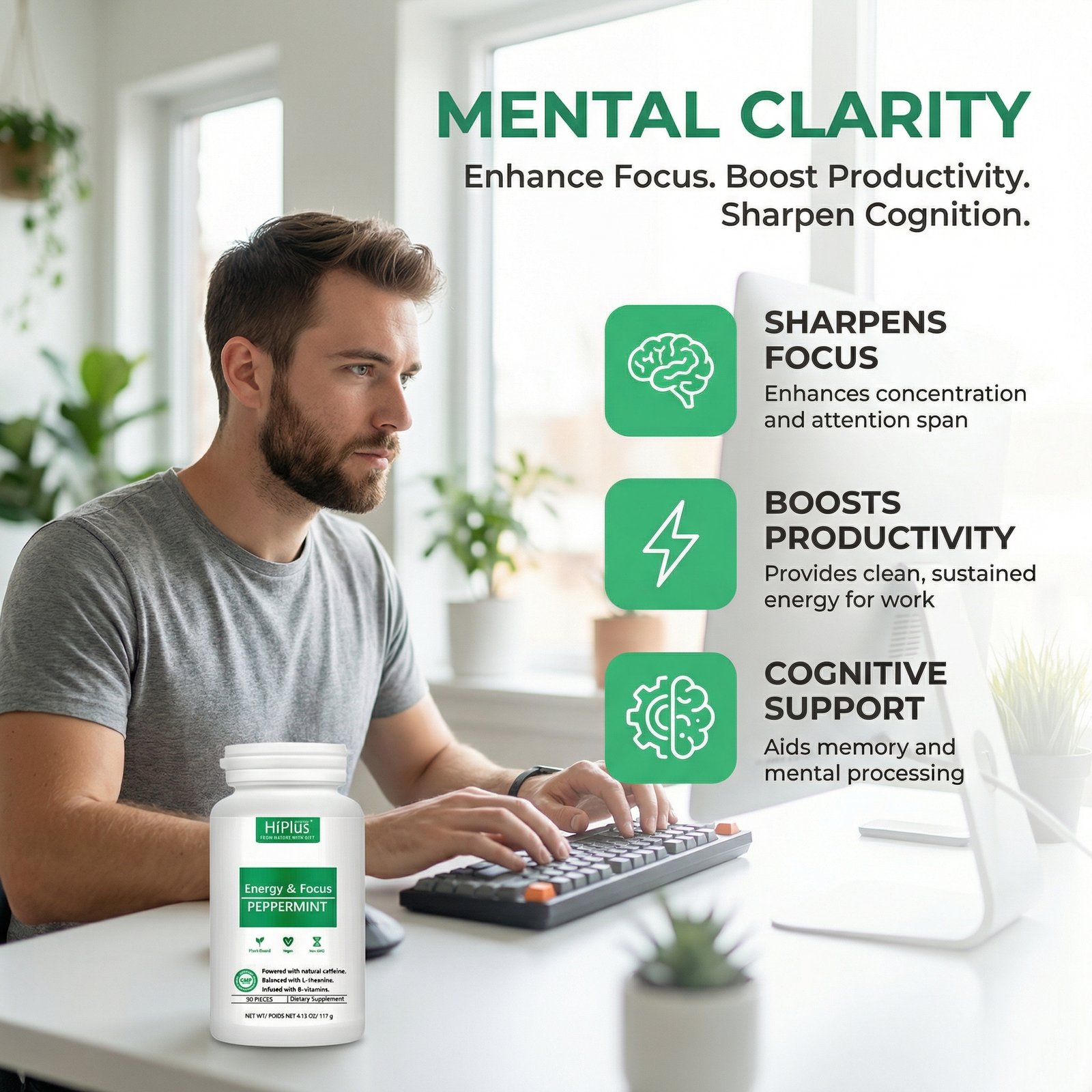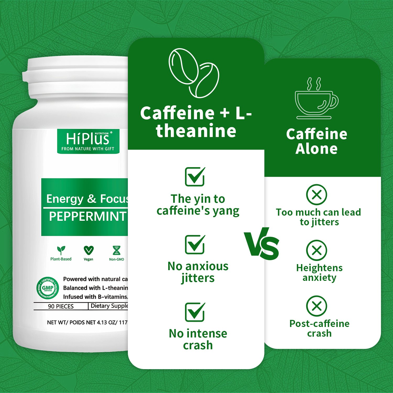 HiPlus® Energy-Focused Peppermint — Sugar-Free Clean Energy Supplement 90 Capsules | Refreshing Peppermint | Natural Caffeine, L-Theanine & B-Vitamins