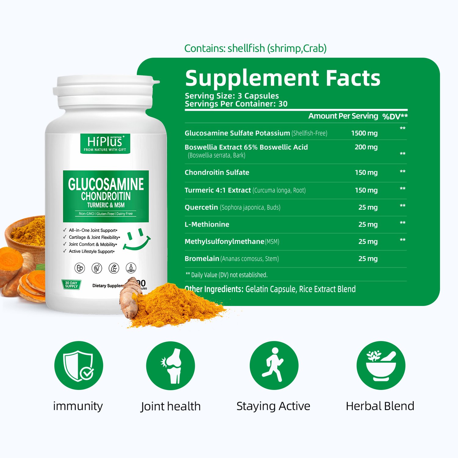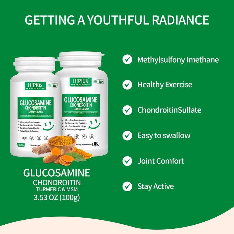 HiPlus® Glucosamine Chondroitin MSM & Turmeric Complex Capsules are an advanced supplement designed to maintain joint flexibility and bone health. This product uses a powerful 8-in-1 golden ratio, with core ingredients including 1500mg of shellfish-free glucosamine, chondroitin, MSM, and a 4:1 concentrated turmeric extract. These ingredients work synergistically to effectively relieve joint discomfort, improve range of motion, and provide key nutritional support for cartilage tissue, helping you maintain peak performance during exercise, hiking, or a busy workday.
