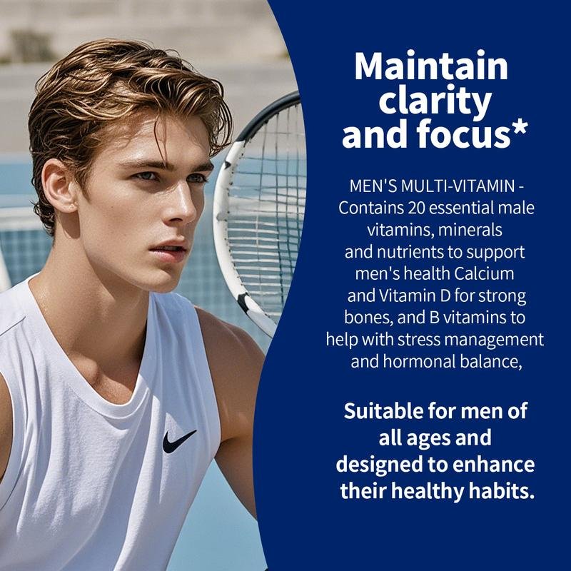 This formula selects over 20 essential vitamins and minerals for men, designed to comprehensively support energy metabolism, immune defense, and muscle function with a simple two-capsule daily regimen. The B vitamin complex effectively relieves stress and boosts daily energy; zinc focuses on prostate and reproductive health; and vitamin D3 and magnesium provide core support for bone strength and mental confidence. The product adheres to cleanliness standards of being non-GMO, allergen-free, and free of artificial additives. Whether you are a professional focused on your career or a fitness enthusiast, this highly effective and pure capsule is the ideal companion for improving your physical fitness and maintaining long-term health.
