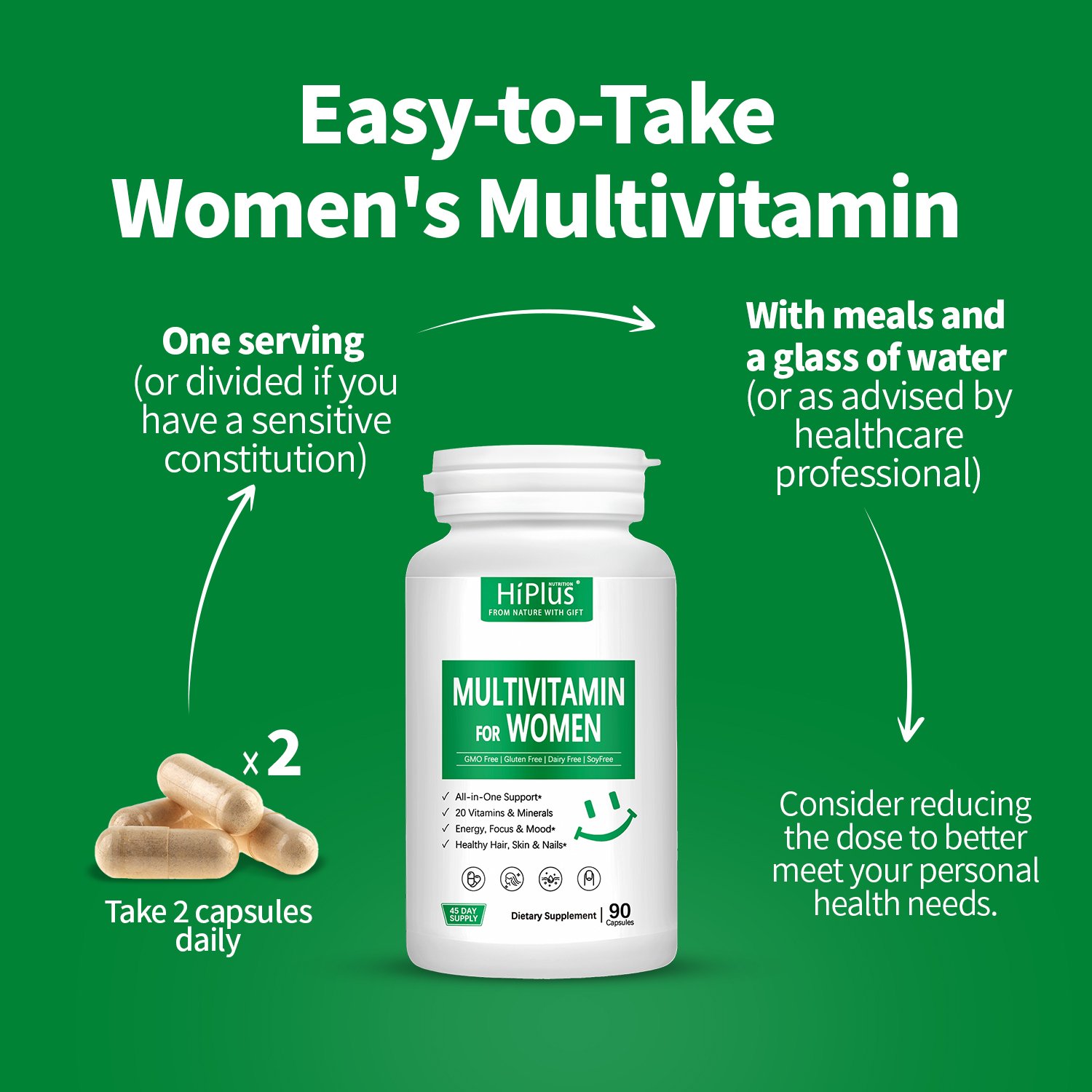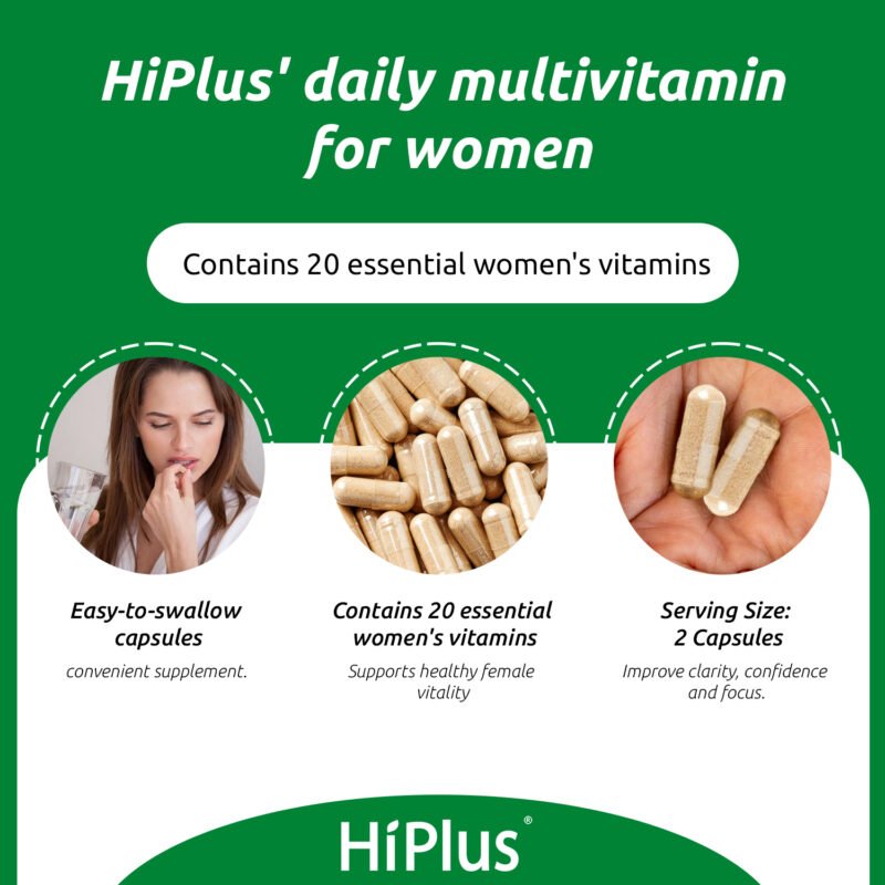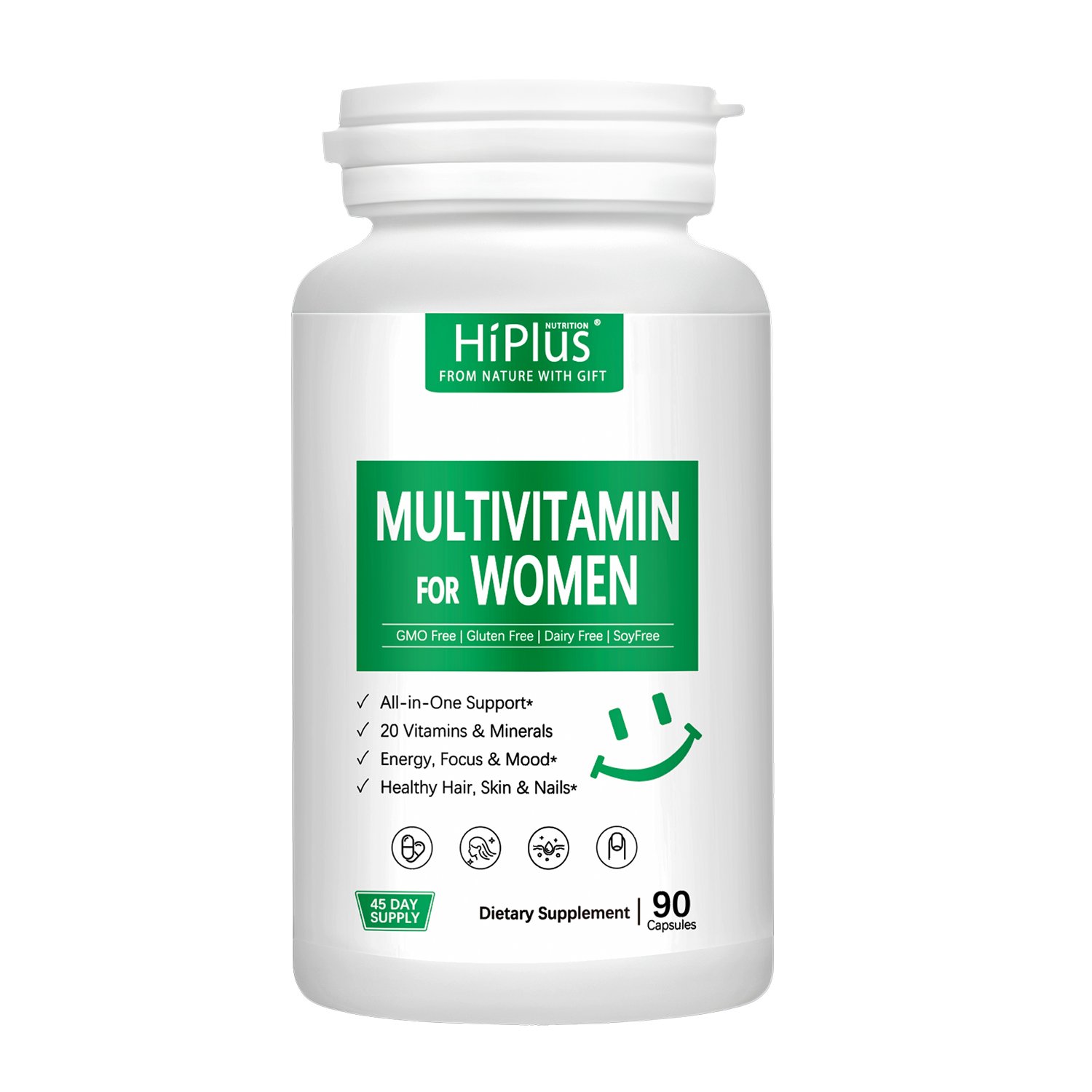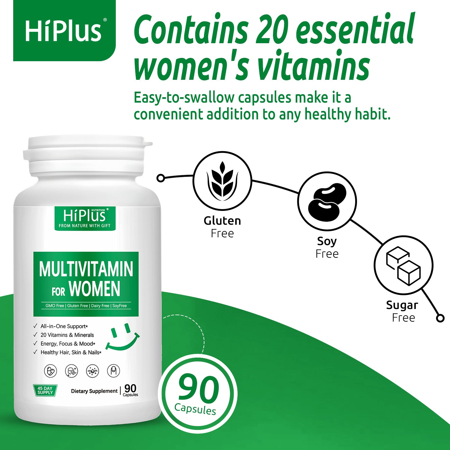 HiPlus® Multivitamin for Women — Daily Energy, Focus & Vitality Support 90 Capsules | 20 Essential Vitamins & Minerals | Non-GMO, Vegan & Gluten-Free