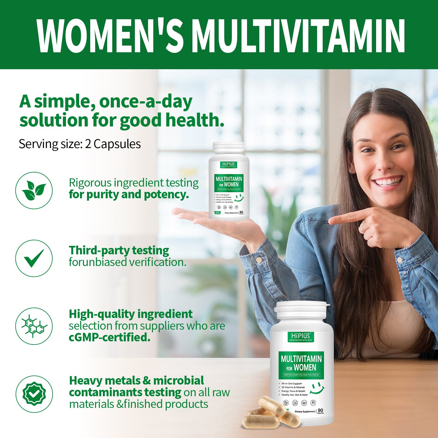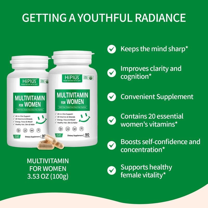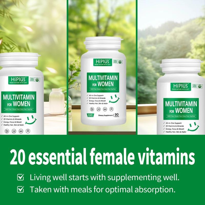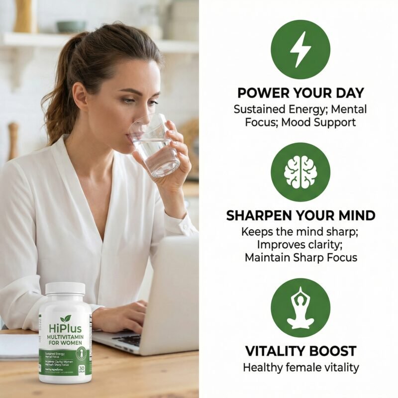 HiPlus® Multivitamin for Women — Daily Energy, Focus & Vitality Support 90 Capsules | 20 Essential Vitamins & Minerals | Non-GMO, Vegan & Gluten-Free