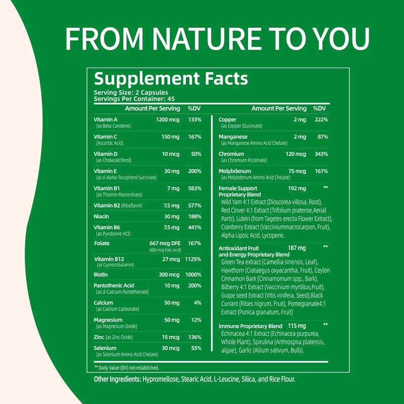 20 Essential Nutrients: Includes key vitamins (A, C, D, E, B12) and minerals (Zinc, Magnesium, Selenium) tailored for women.