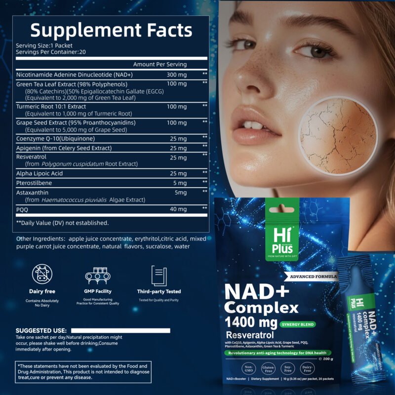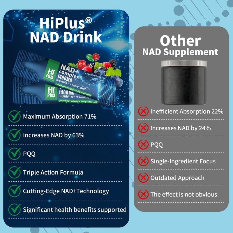 HiPlus® NAD+ Berry Drink is a revolutionary anti-aging cellular energy supplement. Utilizing advanced liposome delivery technology, each packet delivers a precisely targeted 1,400 mg of a highly effective synergistic formula. Key ingredients include 300 mg of high-purity NAD+, deeply blended with top antioxidant nutrients such as resveratrol, astaxanthin, coenzyme Q10, and PQQ, designed to activate cellular mitochondria from the inside out, enhance DNA repair capabilities, and significantly improve daily performance and focus.