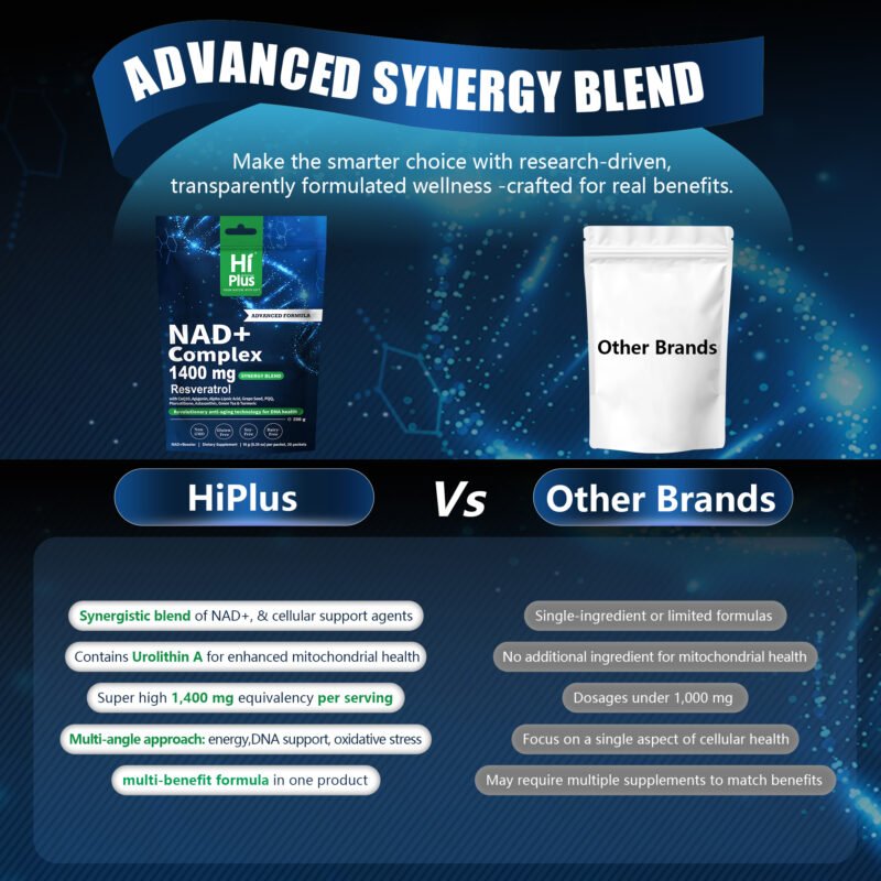 Unlike single-ingredient supplements on the market, HiPlus employs a **”multi-dimensional cellular support strategy”**, adding green tea extract (98% polyphenols), alpha-lipoic acid, and apigenin to build a strong cellular defense barrier. This product adheres to a pure standard of 0 sugar, gluten-free, and dairy-free, featuring a refreshing and pleasant natural berry flavor. Its portable, individually wrapped design allows you to easily add it to your drinking water anytime, anywhere, providing a simple, cellular-level revitalizing experience in your busy urban life.
