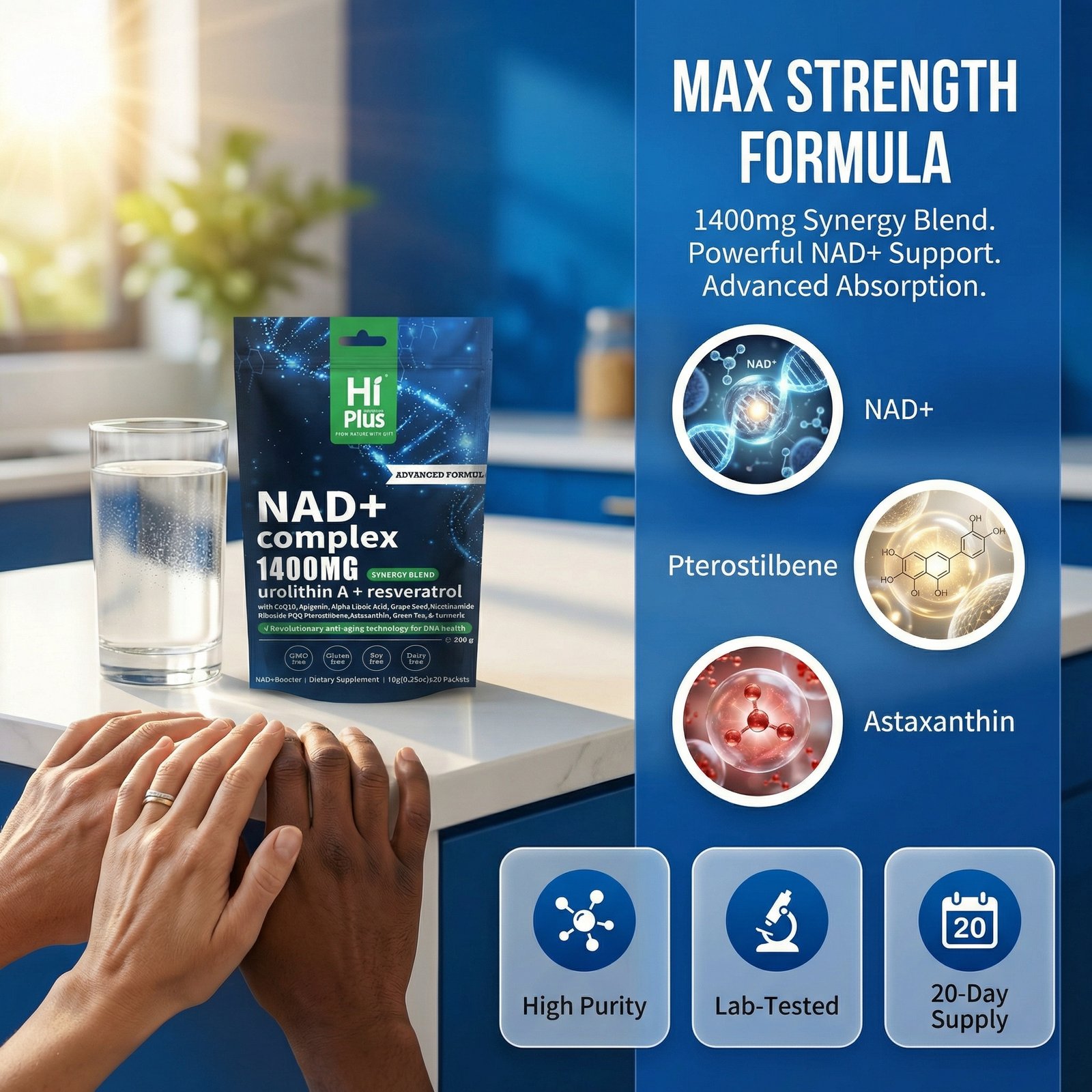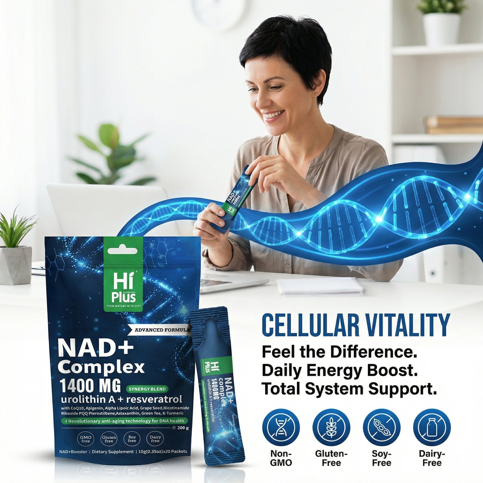 Unlike single-ingredient supplements on the market, HiPlus employs a **”multi-dimensional cellular support strategy”**, adding green tea extract (98% polyphenols), alpha-lipoic acid, and apigenin to build a strong cellular defense barrier. This product adheres to a pure standard of 0 sugar, gluten-free, and dairy-free, featuring a refreshing and pleasant natural berry flavor. Its portable, individually wrapped design allows you to easily add it to your drinking water anytime, anywhere, providing a simple, cellular-level revitalizing experience in your busy urban life.