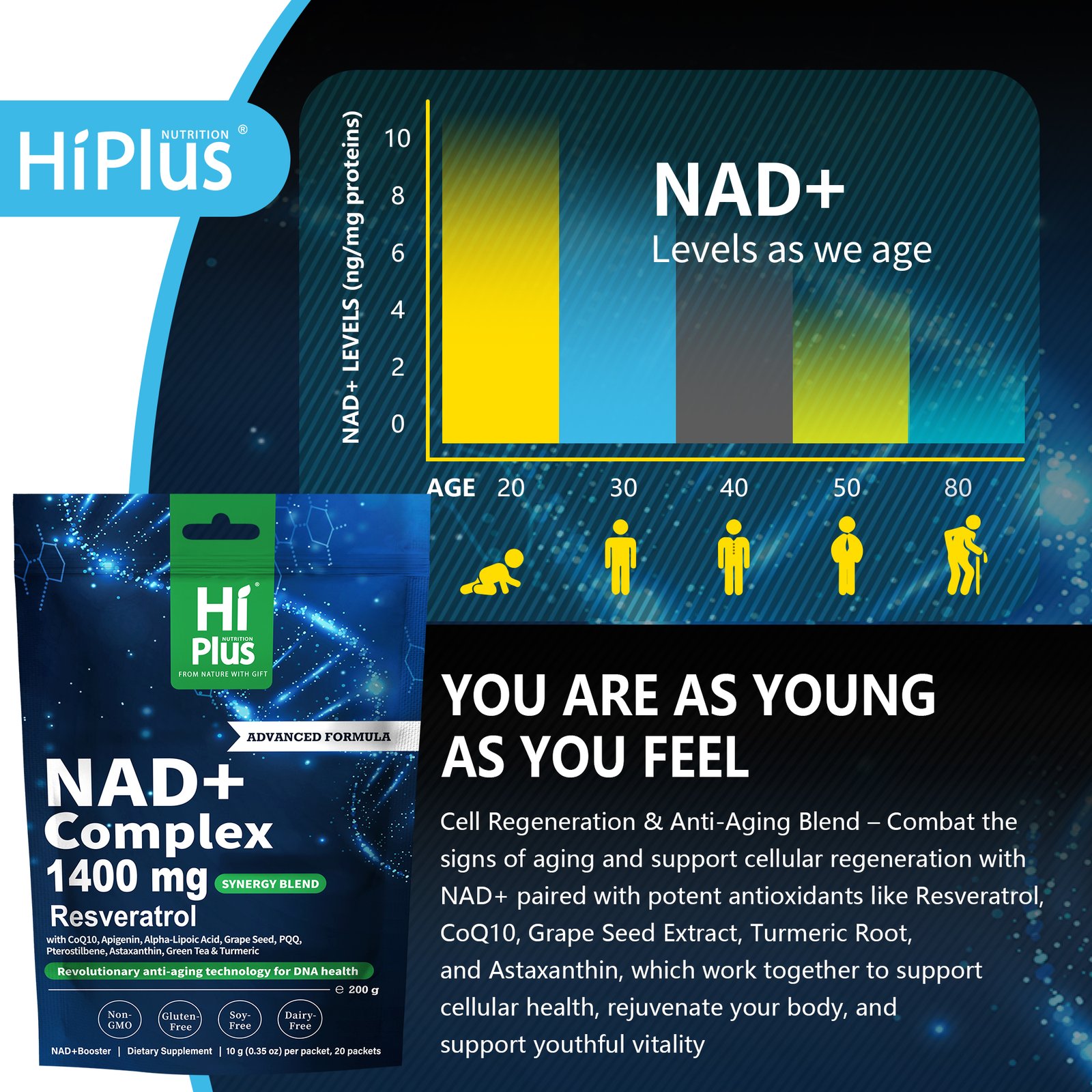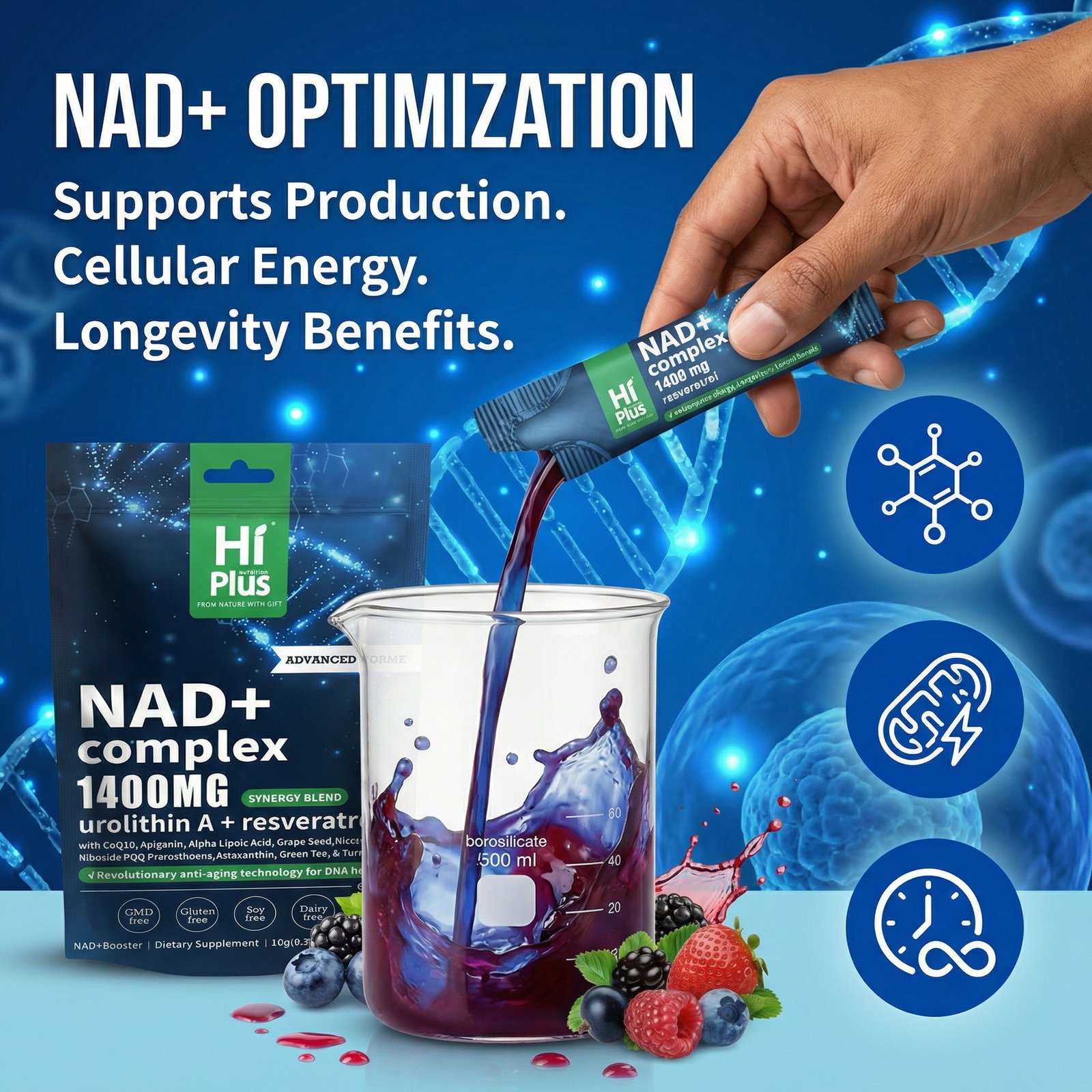 HiPlus® NAD+ Berry Drink is a revolutionary anti-aging cellular energy supplement. Utilizing advanced liposome delivery technology, each packet delivers a precisely targeted 1,400 mg of a highly effective synergistic formula. Key ingredients include 300 mg of high-purity NAD+, deeply blended with top antioxidant nutrients such as resveratrol, astaxanthin, coenzyme Q10, and PQQ, designed to activate cellular mitochondria from the inside out, enhance DNA repair capabilities, and significantly improve daily performance and focus.