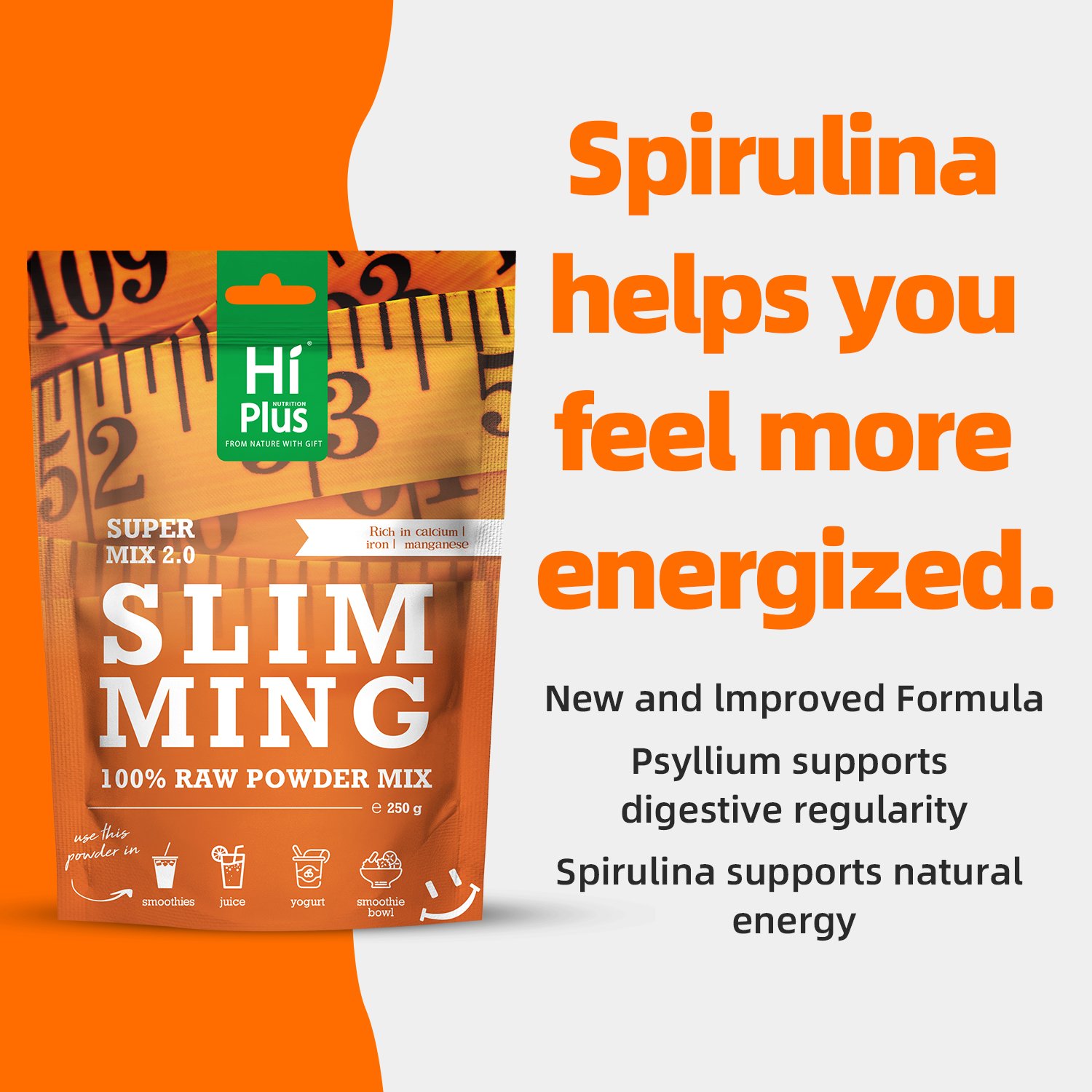 HiPlus® Natural Superfood Blend is a fully fortified formula designed for modern, fast-paced lifestyles. This product utilizes innovative “Proprietary Mix 3.0” technology to perfectly blend the powerful life-giving spirulina, guarana, and psyllium husk. Spirulina provides natural energy and vitality, guarana helps promote metabolism and body balance, and psyllium husk, rich in soluble dietary fiber, effectively supports the healthy functioning of the digestive system.