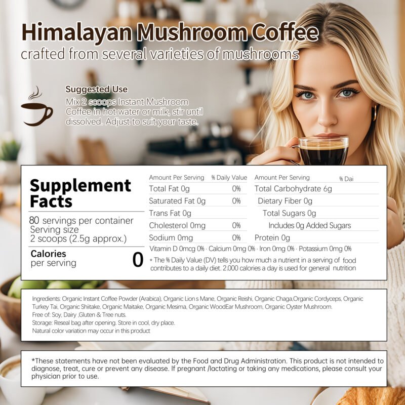 Sustained Energy: Provides a reliable energy boost through premium Arabica coffee while adaptogenic mushrooms prevent typical caffeine crashes.
