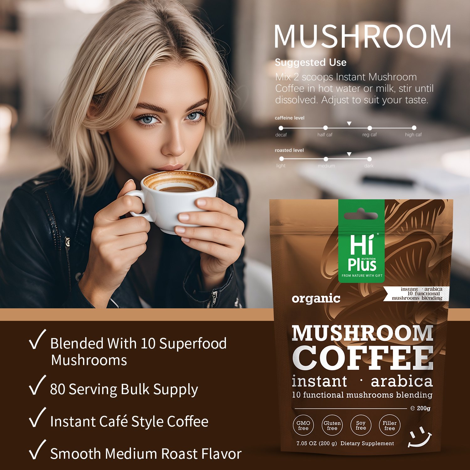 HiPlus® Organic Instant 10-in-1 Mushroom Coffee — Premium Arabica Blend 7.05 oz (200g) | 80 Servings | 10 Superfood Mushrooms | Keto & Vegan Friendly