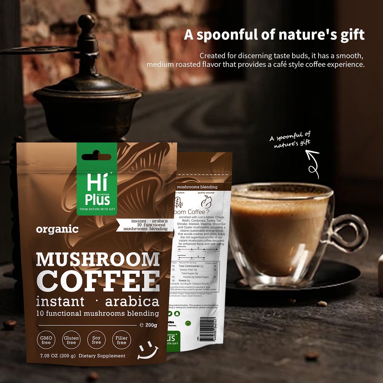 HiPlus® Organic 10-in-1 Instant Mushroom Coffee is an innovative beverage that perfectly blends premium Arabica coffee with 10 superfood probiotic mushrooms. Using advanced blending technology, this product retains the smooth taste of medium-roasted coffee while incorporating 10 functional ingredients, including Hericium erinaceus, Ganoderma lucidum, Chaga mushroom, and Cordyceps sinensis, designed to provide you with longer-lasting and more stable energy support.