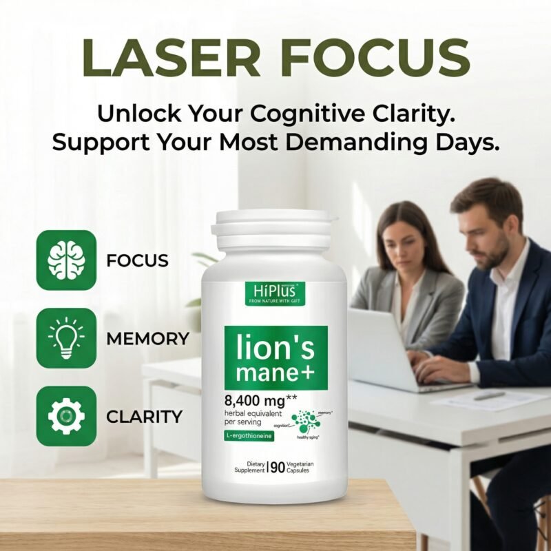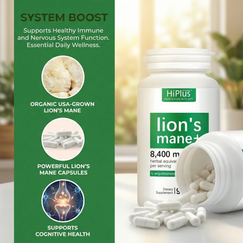 HiPlus® Organic Lion’s Mane Capsules are a superior supplement combining a high concentration of herbal extracts with cutting-edge antioxidants. Each serving contains the equivalent of 8,400mg of virgin lion’s mane mushroom energy, extracted from the whole fruiting body and mycelium, designed to deeply activate brain potential, enhance focus, and strengthen nervous system health.