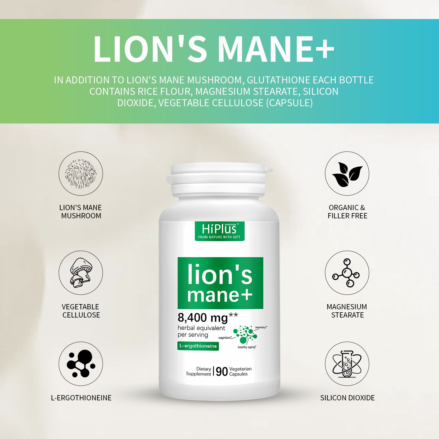 HiPlus® Organic Lion’s Mane Mushroom Supplement Capsules