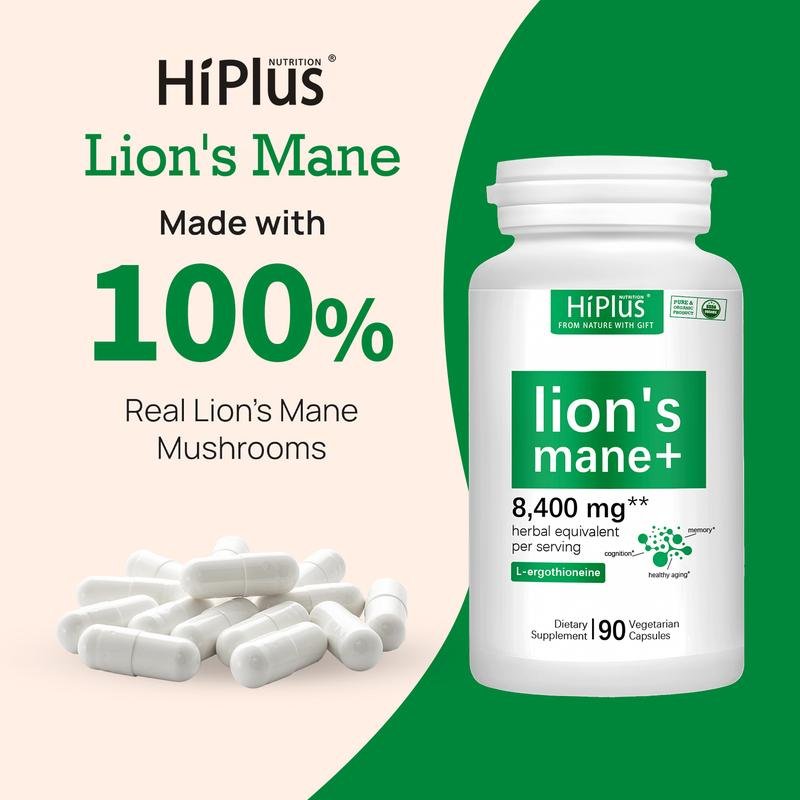 HiPlus® Organic Lion’s Mane Capsules — 2-in-1 Ultra Strength Brain Support 90 Veggie Capsules | 8,400mg Herbal Equivalent | With L-Ergothioneine & Vegan Formula