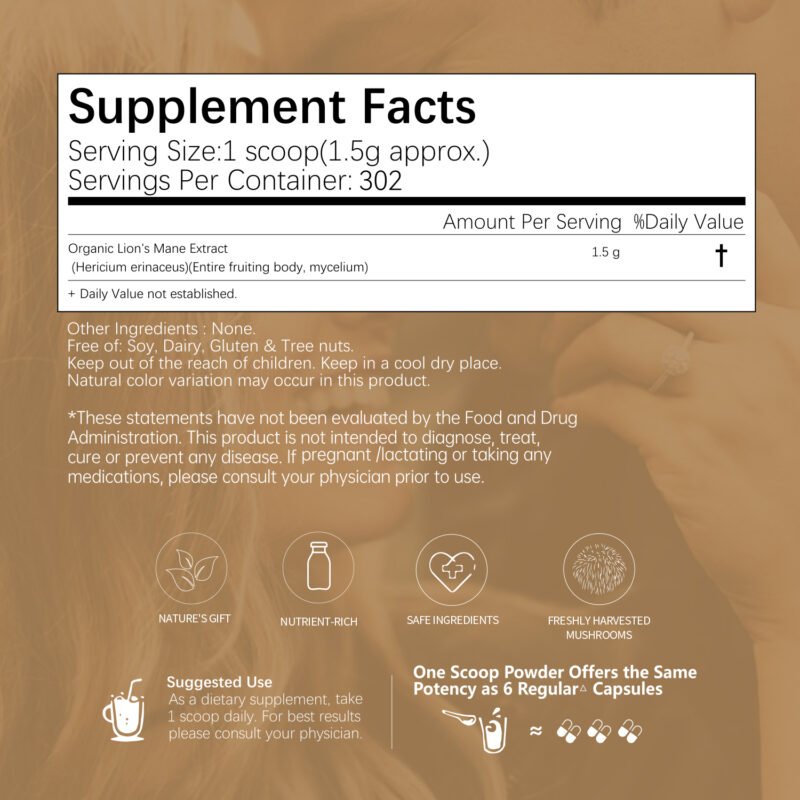 Each serving (one scoop) contains up to 1,500mg of Lion’s Mane extract, equivalent to 6 regular capsules, with faster absorption. This powder has a natural light brown color and a mild taste, blending perfectly into your daily coffee or smoothie. It enhances focus and memory while providing comprehensive support for the immune system. The product promises zero additives and no fillers, and has passed strict third-party laboratory testing. It contains no soy, gluten, or any artificial preservatives, making it a pure choice for your daily brainpower boost.