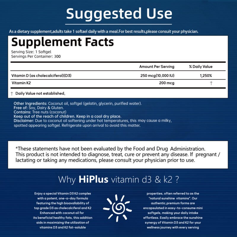 HiPlus® Vitamin D3 & K2 — 10,000 IU + 200 mcg Extra Strength Formula 300 Softgels | Made with Coconut Oil | Immune, Bone & Heart Support