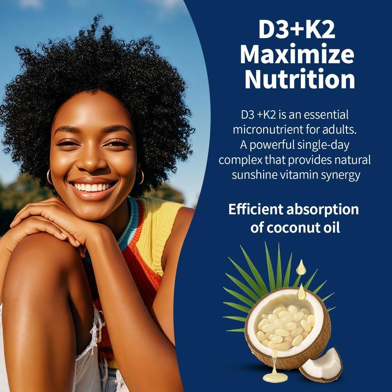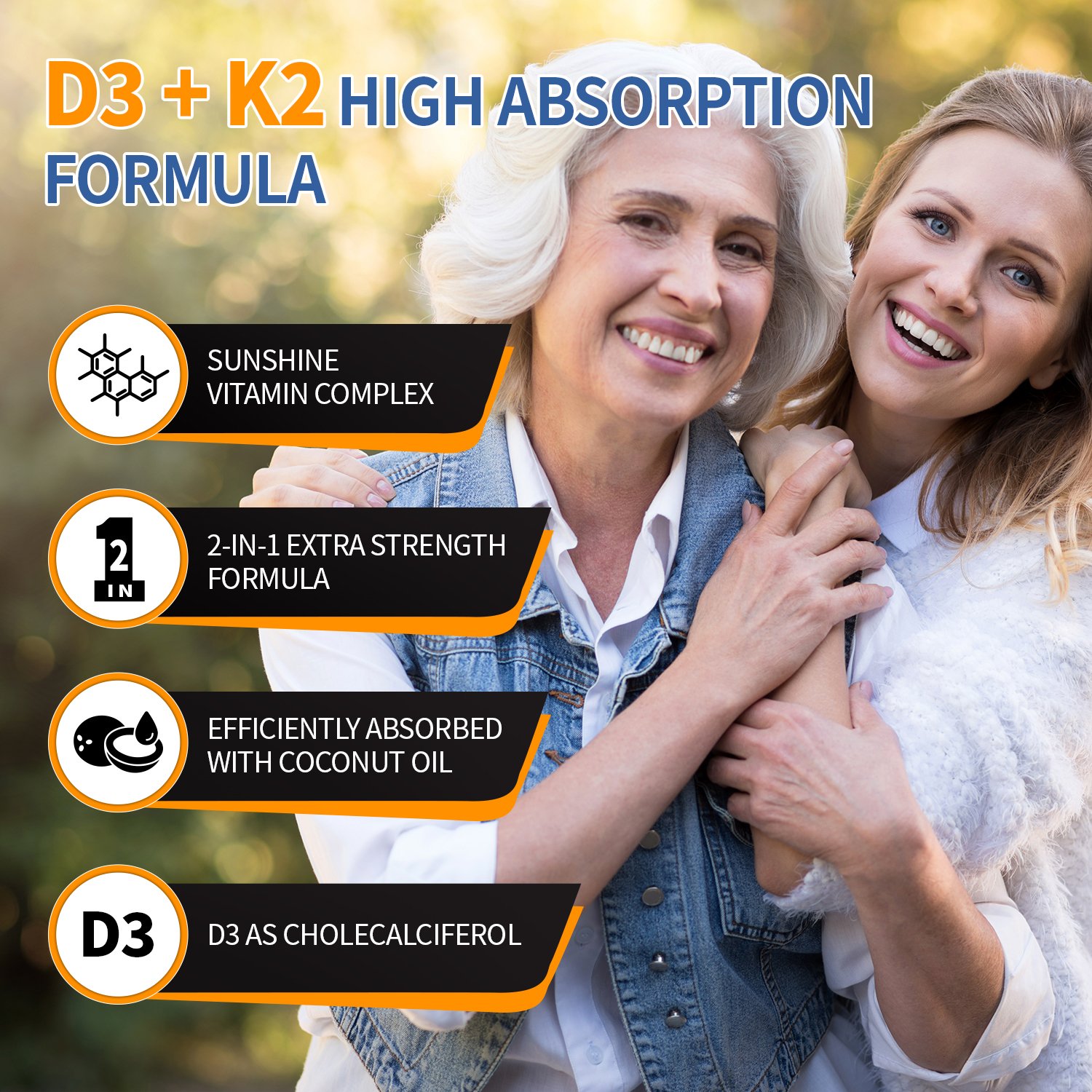 • Advanced Bone Health: Vitamin K2 works synergistically with D3 to direct calcium toward bones, improving density and strength.
